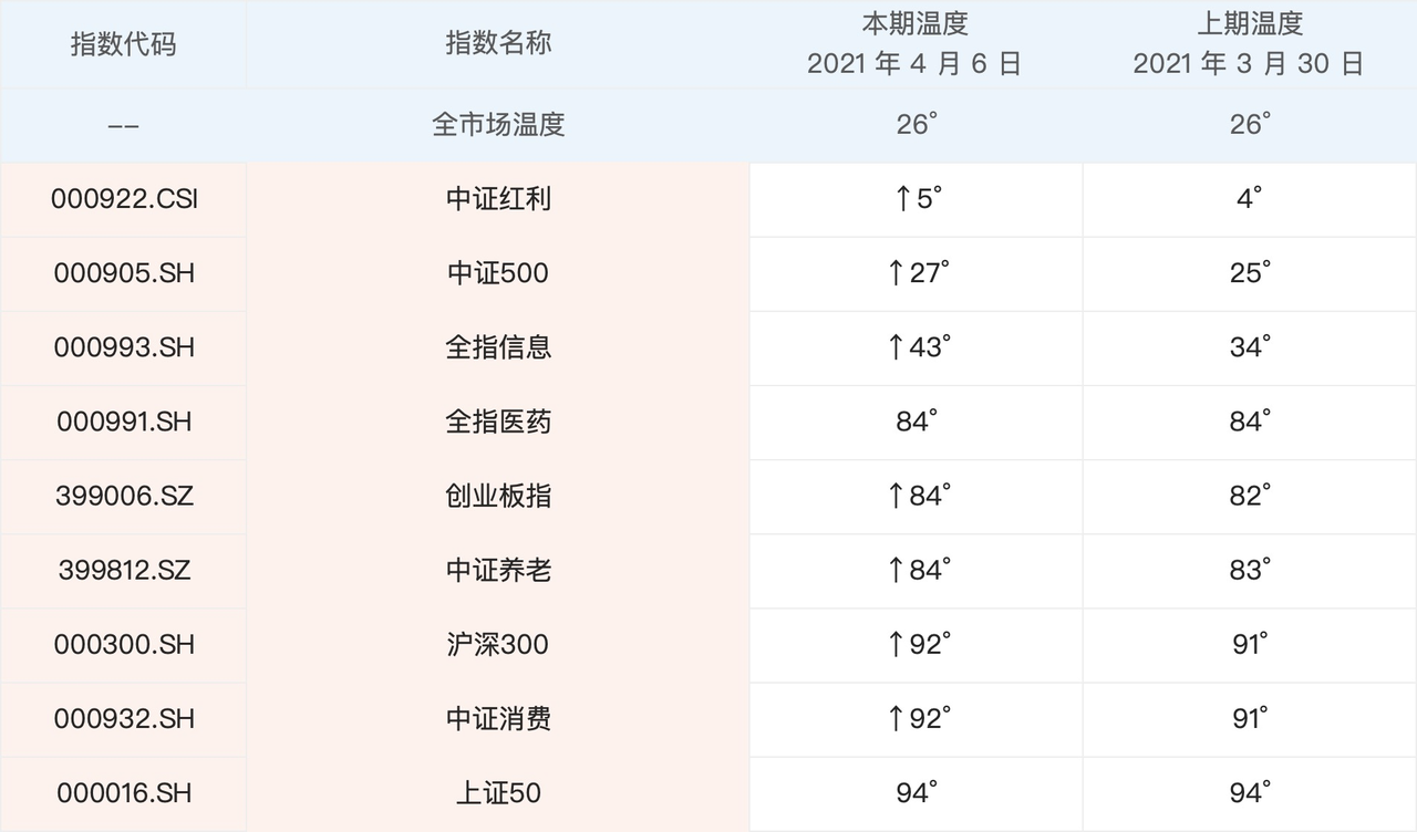 最新股市温度为 26°,跟上期比,涨幅只体现在小数尾数上,取整后是一样的,这说明市场整体变化不大。具体指数上,除了全指信息之外,其余变化较小。全指信息最新温度达到了 43°,之前趁着全指信息回调,买了两份,目前来看,买的位置还是不错的。日后如果继续上涨,到时候新进入的用户估计就不能买了。