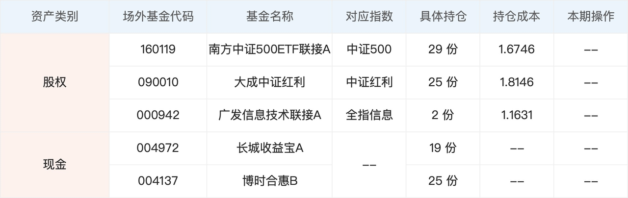 根据最新温度和我们的持仓情况,本期不发车。最新的参考持仓见下图。之前没有跟车的,现在仍然可以按照参考持仓进行操作:把自己的投入本金分成 100 份,按照中证500、中证红利、全指信息建议的具体持仓份数买入,其余资金放在货币基金、活期理财里,随时能跟车就行。