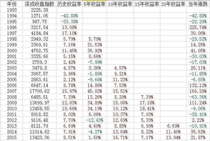 6、97 + 5 = 02(五年亏)、00 + 5 = 05(五年亏)、07 + 5 = 12(五年亏)……每次连涨两年你再买入,持有五年都是亏损的!只要你不是在连涨两年之后买入,持有五年(除 04、14 两次)、十年、十五年、二十年你必然会赚钱!而且收益率非常好。