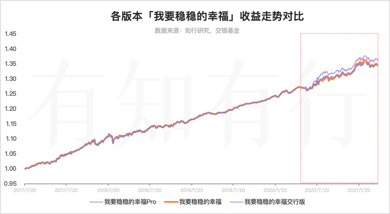 不过由于产品本身属于「固收+」,打新基金和偏股基金的占比不高,再加上 3 个版本的股票仓位差距也较小,所以收益虽然有区别,但区别不大。