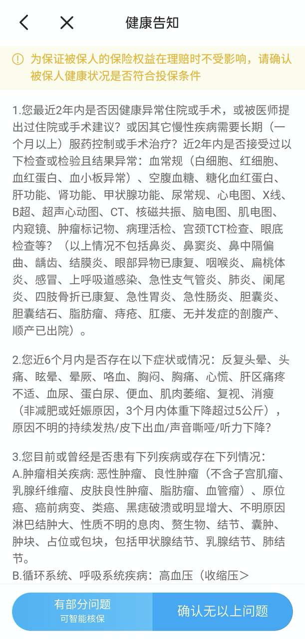 2)智能核保。大多数产品是支持智能核保的,点击健康告知页面的「有部分问题」之后,会进入智能核保的页面。它的操作很简单,选择相应的异常,回答几个问题,就可以得到核保结果。