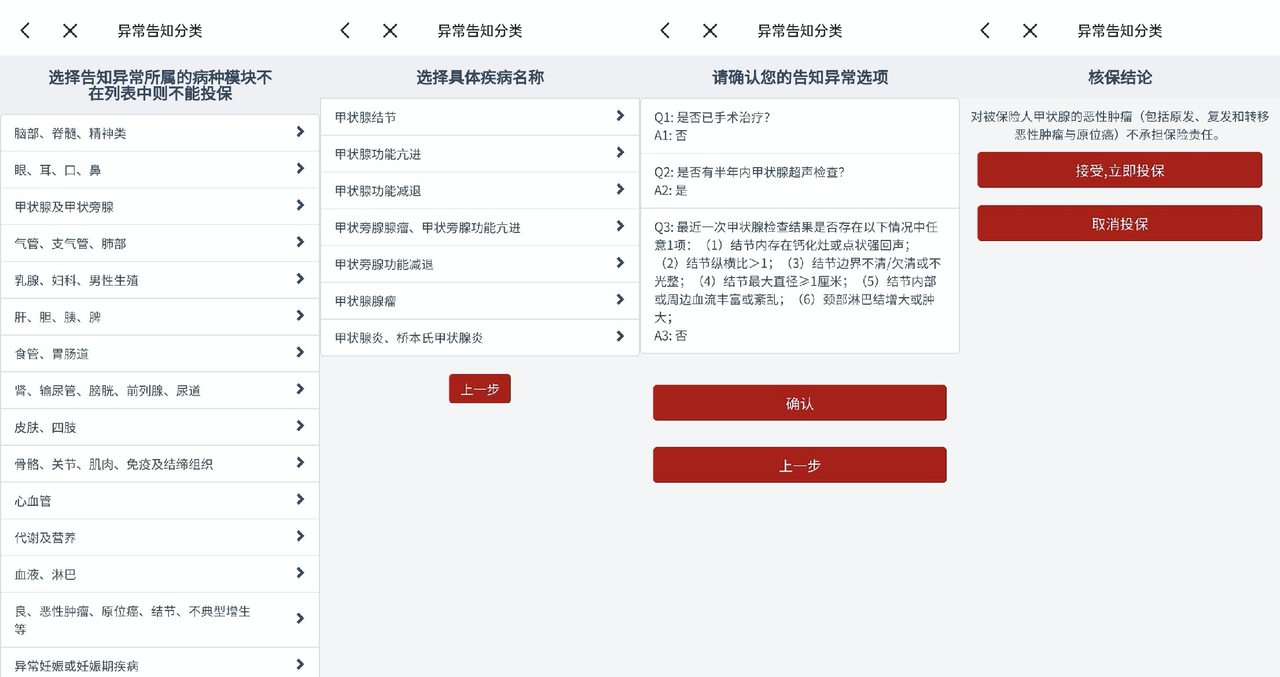 它比较方便,我们能很快的知道自己能不能投保。但缺点是异常项目覆盖得没那么全面,如果要告知的异常项目在列表中找不到,就不能投保了。