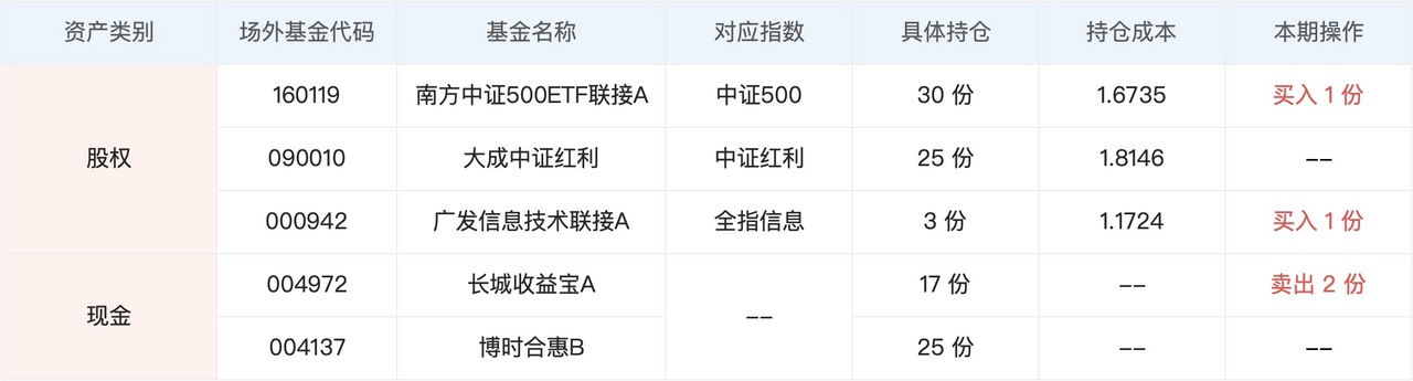 根据最新股市温度,我们的参考仓位是 50%~60%。目前还没达到仓位上限,本期发车两份:一份中证500、一份全指信息。之前跟车的朋友,用自己的现金部分跟车就行。新用户按照下面的具体持仓,进行买入。