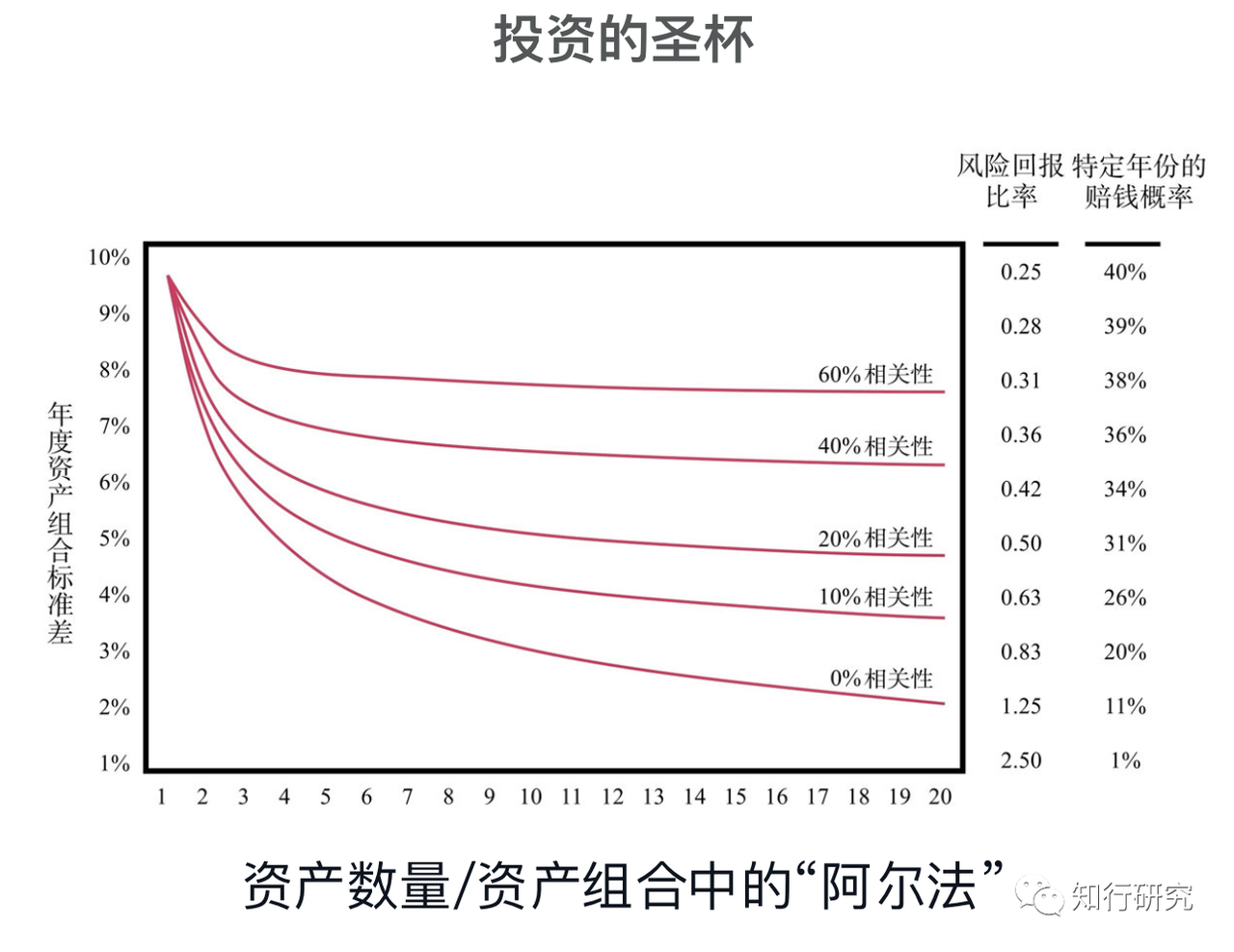 在达里奥的《原则》一书中有一张图表,直观地展示了在逐渐增加具有不同相关性的投资时,资产组合的波动性如何减弱、组合风险回报比率如何提升。
