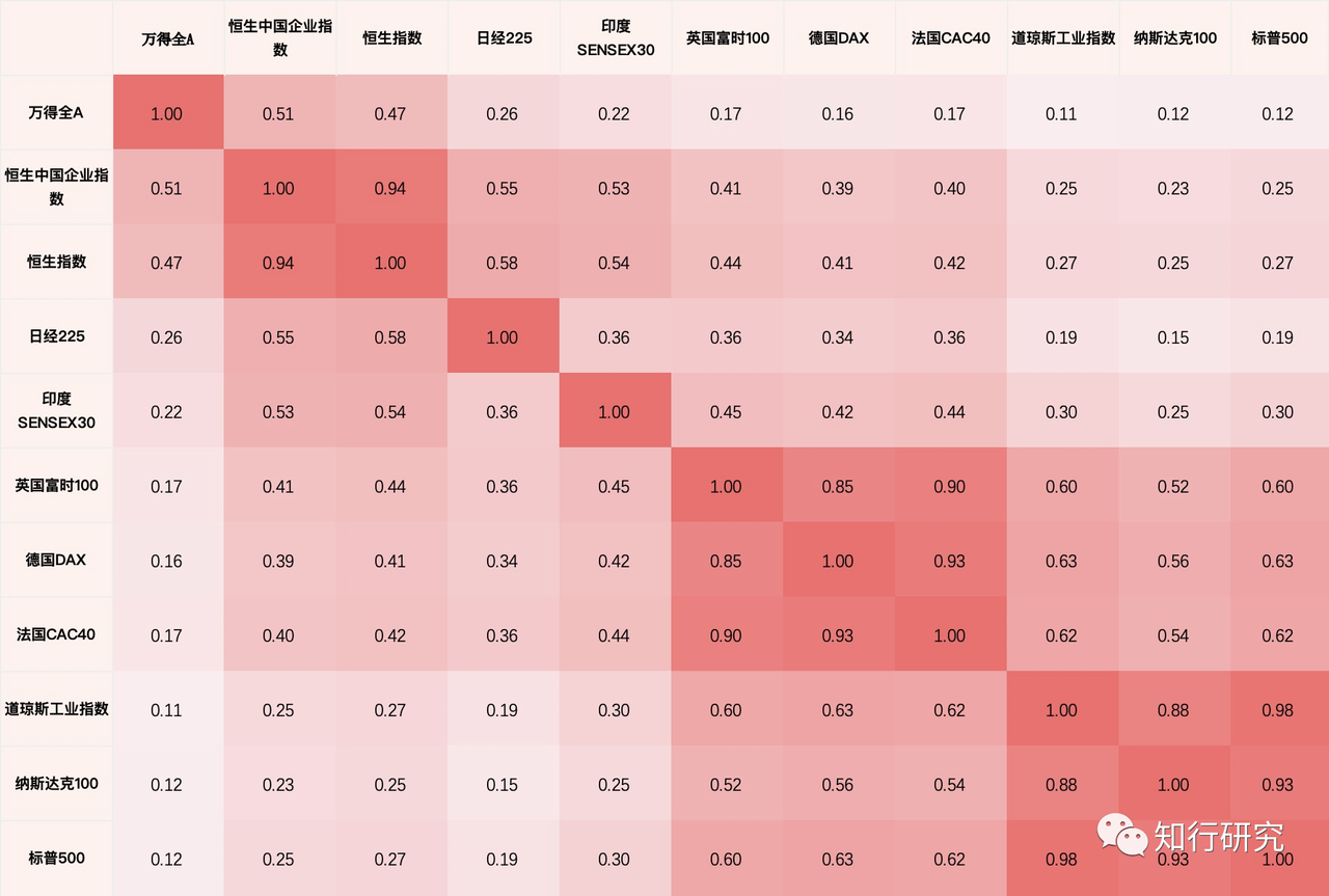 接下来,我们就使用 Pearson 相关性系数,分别对A股市场、全球不同股票市场、不同大类资产进行相关性分析,看看不同的资产层级之间,相关性如何。