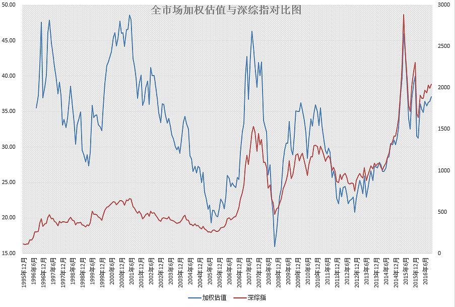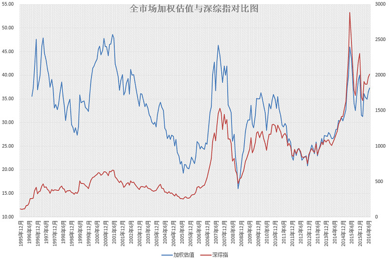 从全市场加权估值(非市值加权,外部综合经济数据加权)来看,A股历史出现过 4 次大顶,分别是 1996、1997、2000、2007、2015。这三次大顶的高度几乎完全一致,超过 45 的区域,神奇。