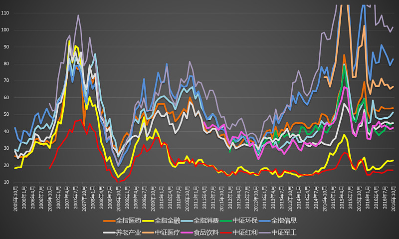 分化得太严重了。这个市场上有 100 倍的军工,80 倍的信息、创业,也有十几倍的 50、红利。