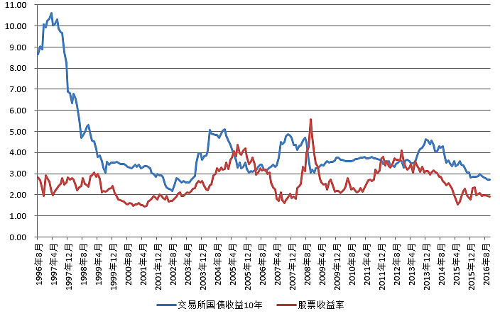 股票收益率历史在 2~4 之间波动,债券是 3~5。现在基本都在下沿。只是说一般情况,有几次比较特殊可以从图上看出来。分别是 2008 年底的股票,和 2002 的债券。