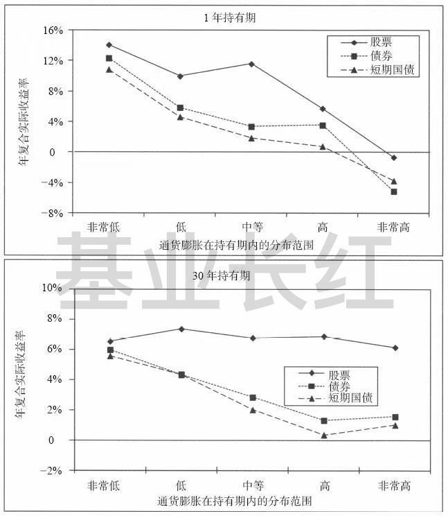 在短期内 (持有 1 年)股票、债券和短期国债都很难有效地对冲通货膨胀风险。但是从长期来看 (持有 30 年),股票的实际收益率几乎不受通胀影响,而债券收益率被远远抛在后面。