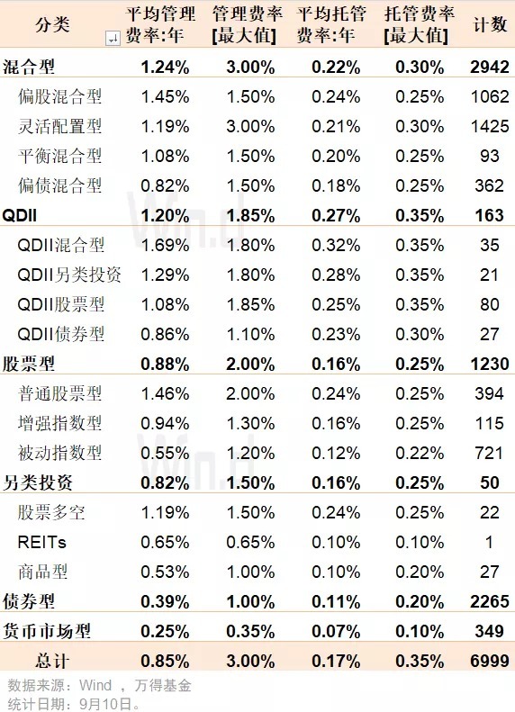 从上表可以看出,管理费用的高低与基金类型有关,管理难度越大的基金管理费收取越高。Wind 数据显示,截止 9 月 10 日,市场上 394 只普通股票型基金(只统计主基金,下同)平均管理费为 1.46%,而被动股票型管理费为 0.55%,增强指数股票型为 0.94%。混合型和 QDII 型基金平均管理费处于较高水平;相比而言,债券型和货基管理费较低,平均分别只有 0.39%、0.25%。