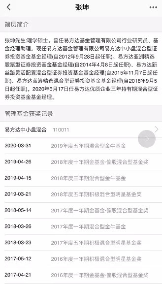 在天天基金上通过搜索基金经理,在个人资料页面,成立时间较长,得奖最多的那只就是他的代表作。