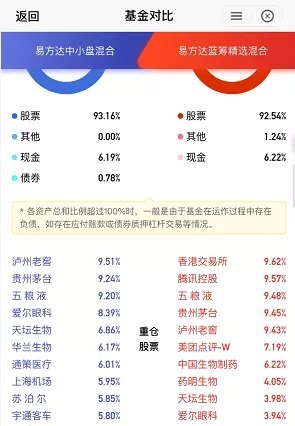 这两只都有重仓白酒股,但是蓝筹精选这只还买了优质的港股,投资范围更广,跟中小盘的定位有一些不同,大家依据自己的偏好来选。