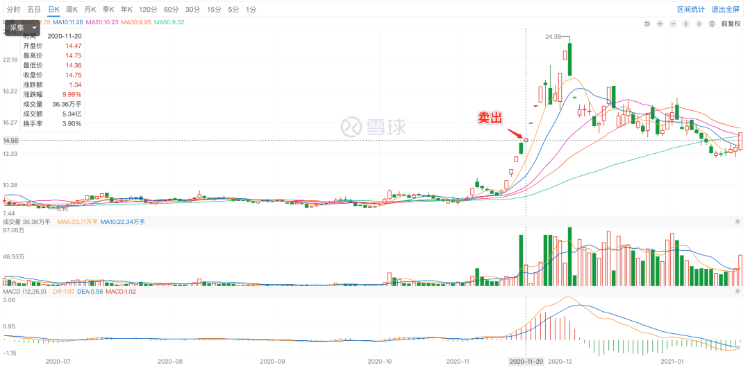 我去查看了一下他妹妹卖出小康股份那天的股价,那天收盘在 14.75 元。
