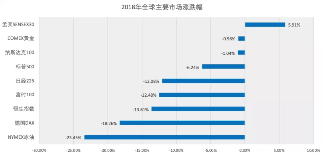 上面这张图是 2018 年全球所有市场的走势。在 2018 年,除非你全部持有现金,或者全部买了债券,否则真的很难赚钱。