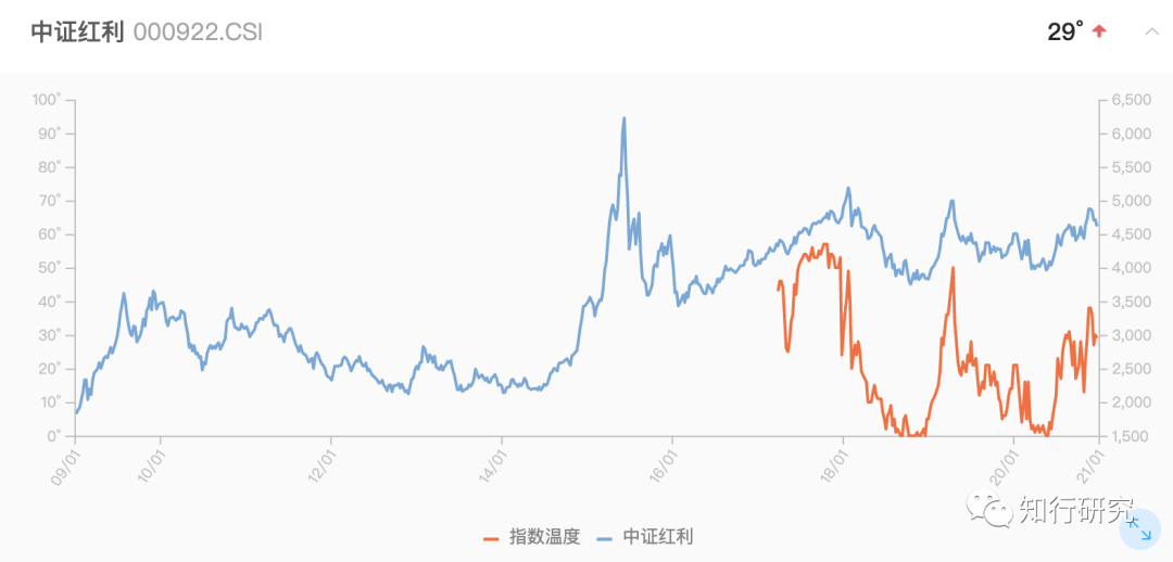 请教下:2020年12月27日,红利指数515080.SH是1.209,温度是29度,而今天2022年6月30日,红利指数1.433,温度却只有2度。这是为什么呢