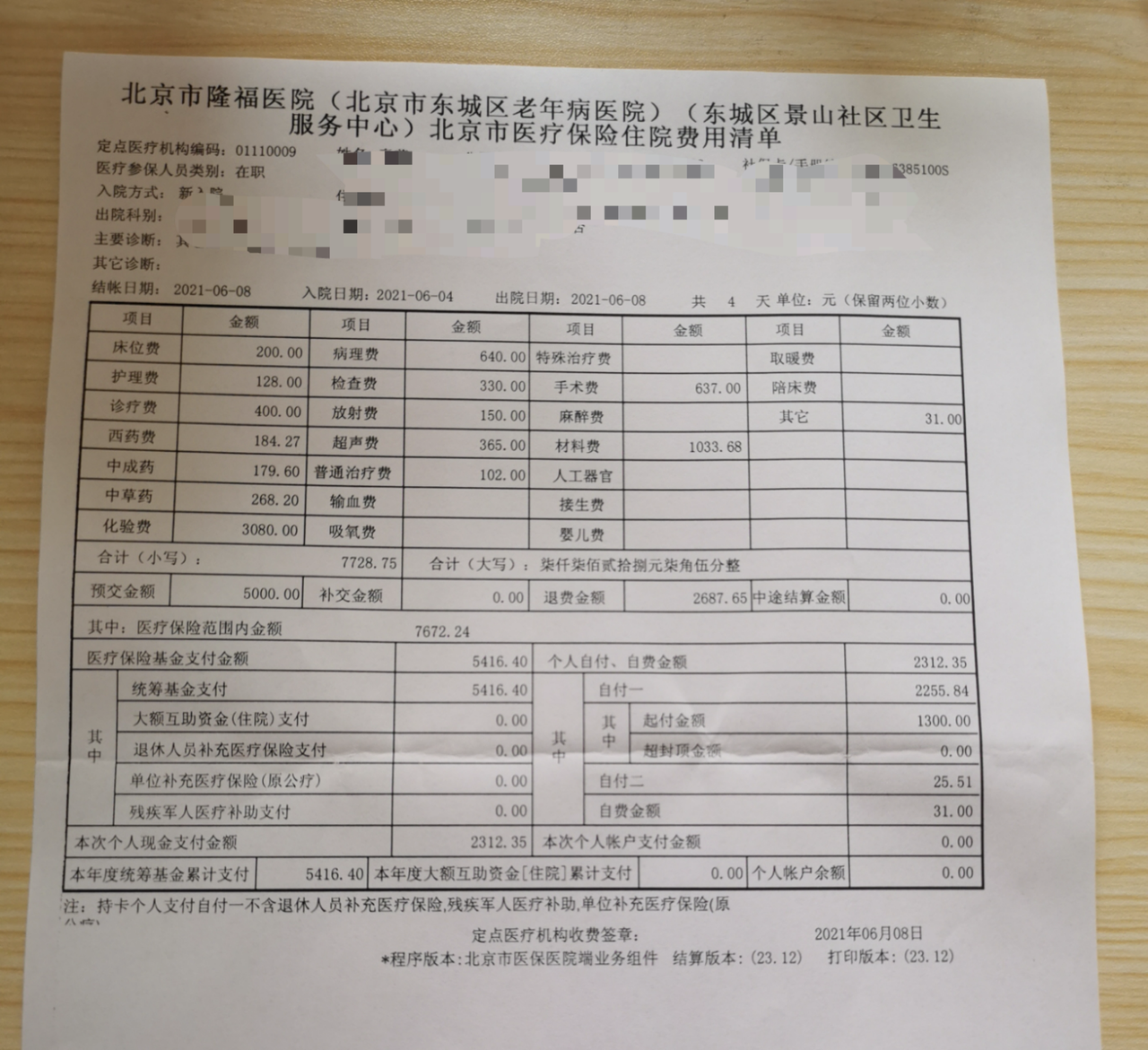 5. 医保报销单:上面会列明医保报销情况,出院结算完费用后,医院通常会给打印;