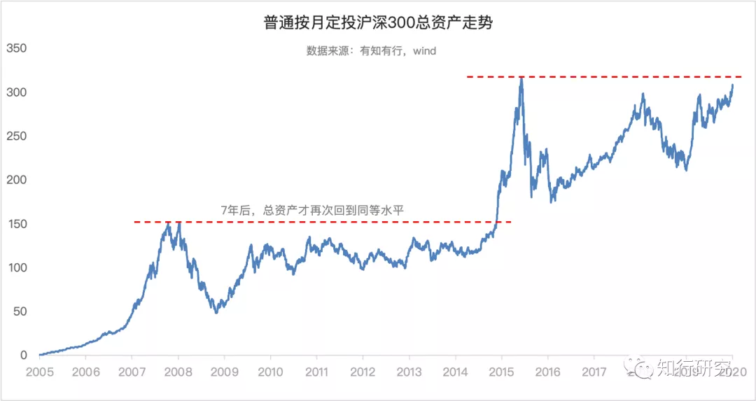 可以看到,假如我们错过了这两个时间点卖出,即使每月依旧继续投入,却要等待数年后才能让总资产回到同等水平。