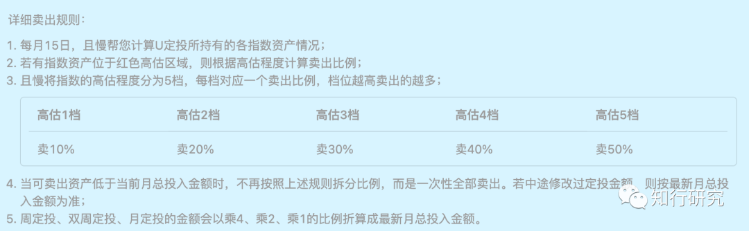 市场上一些常见的策略也确实是这样做的,比如且慢的「U定投」。它设置了 5 个目标估值档位,分别对应着不同的卖出比例。