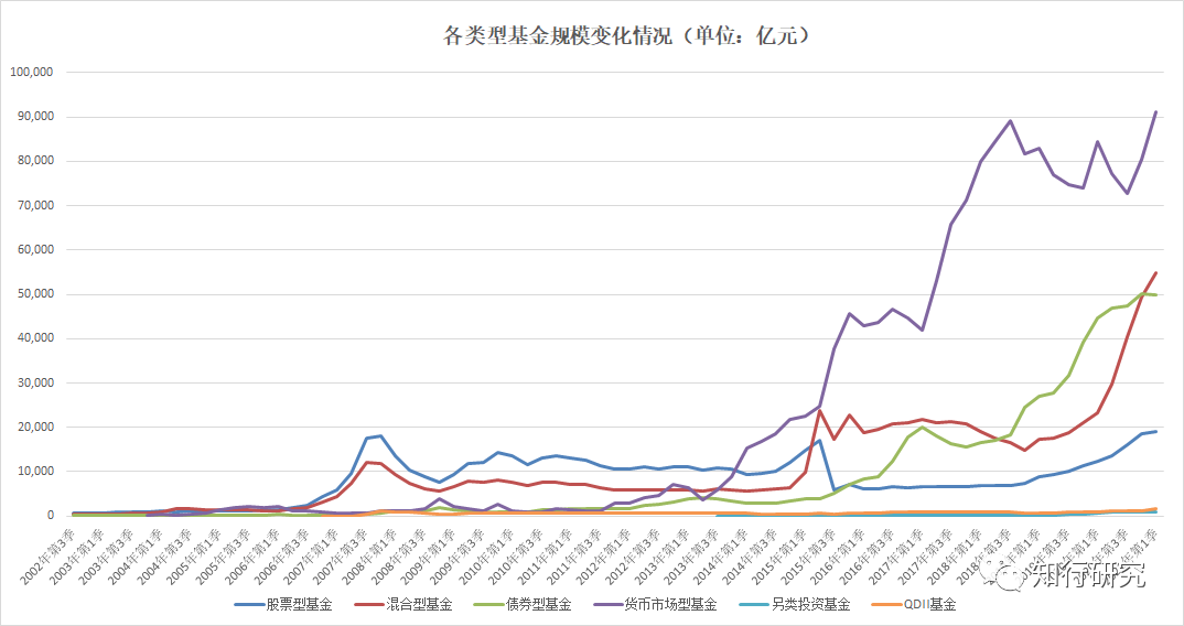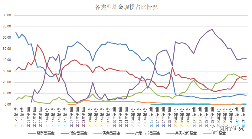 下面两个图是不同类型基金历年来的规模变化以及占比情况,大家可以看看,之前什么类型的基金发展的好,现在又是什么情况了。