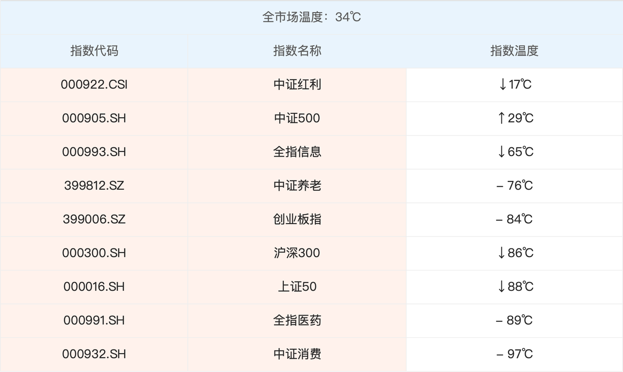 本周最新股市温度为 34℃,跟上期相比,略有降低。参考仓位跟上期一致,仍然是 40%~50%。具体指数方面,中证红利、中证500 还是低估状态。新入资金可以按照参考仓位进行配置。