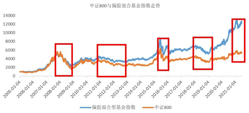 但是,2005 年至 2021 年 6 月底,偏股混合型基金指数翻了 12 倍,同期中证800指数翻了 4.6 倍。