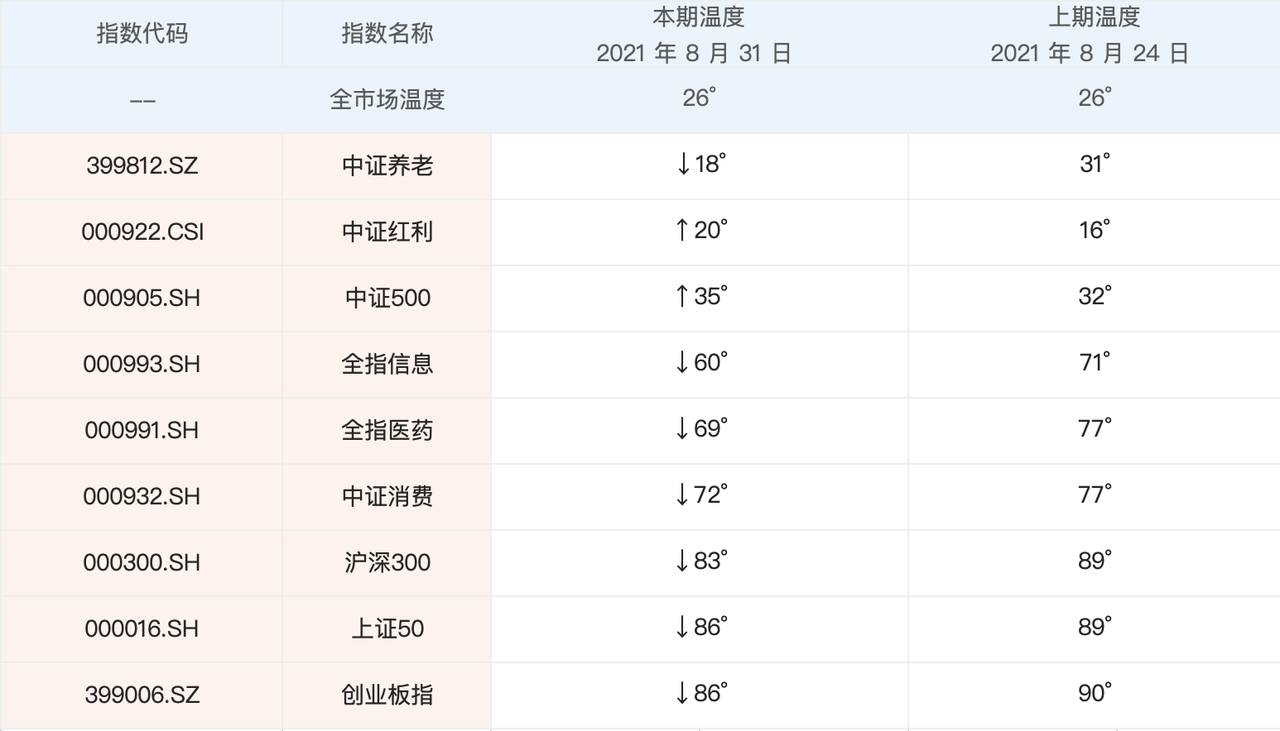 最近中证养老、全指医药、中证消费温度下来的很快。全指信息经过之前的上涨,最近也跌了一些。目前中证养老已经成为这些指数里面温度最低的了。