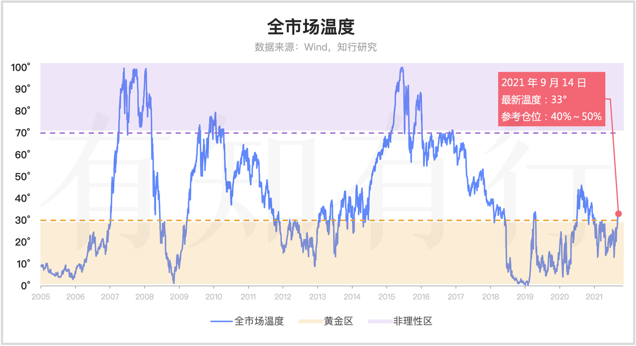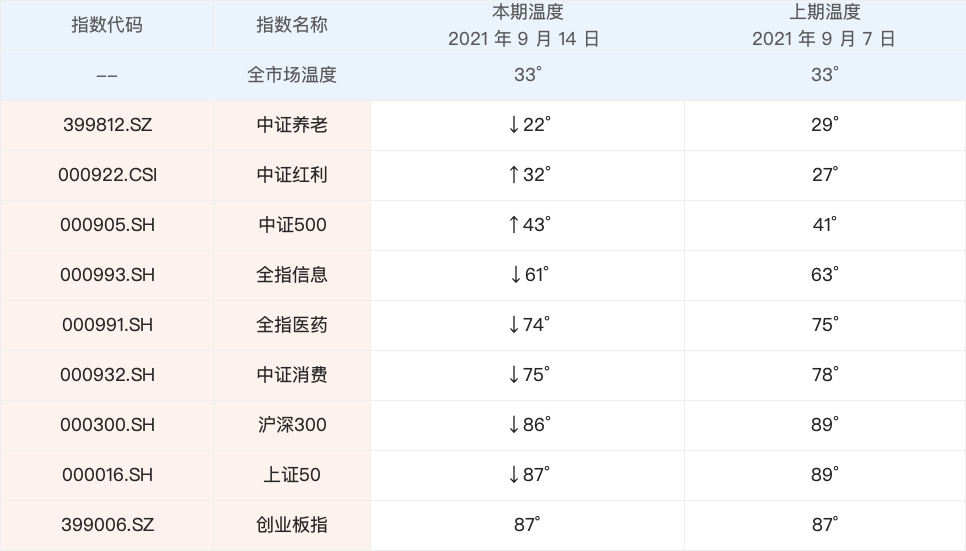 我们来看一下全市场温度情况。全市场温度过去一周先涨后跌,最新温度是 33°,跟上期一样。具体指数方面,温度有涨有跌。中证红利和中证500的温度上涨了,创业板指的温度没变,其他指数或多或少的出现了下跌。