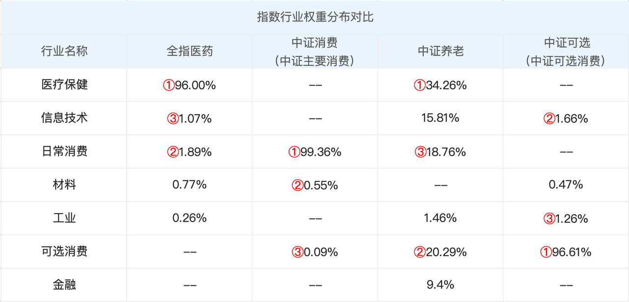 中证养老的温度为什么下来得这么快?主要原因是它的成份股大多数都出现了下跌。下面是中证养老、全指医药、中证消费(中证主要消费)、中证可选(中证可选消费)的行业权重分布情况。