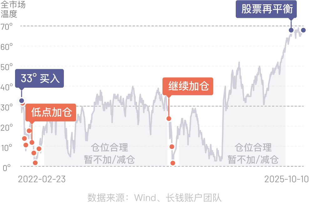 这是长钱账户示例账户的调仓记录:市场温度偏低时,增加股票类仓位;温度回升后,仓位合适暂无操作;温度偏高时,进行再平衡或降低股票类仓位。