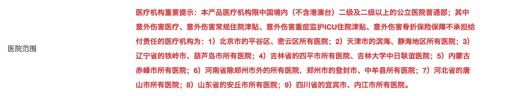 孝心安 5 号有不少除外医院,例如在河南,除了郑州(不包括登封市、中牟县),其他地区的医院无法纳入理赔。一位同事的父母住在洛阳,虽然顺利通过健康告知,但因无法使用当地医院,最终也放弃了这款产品。