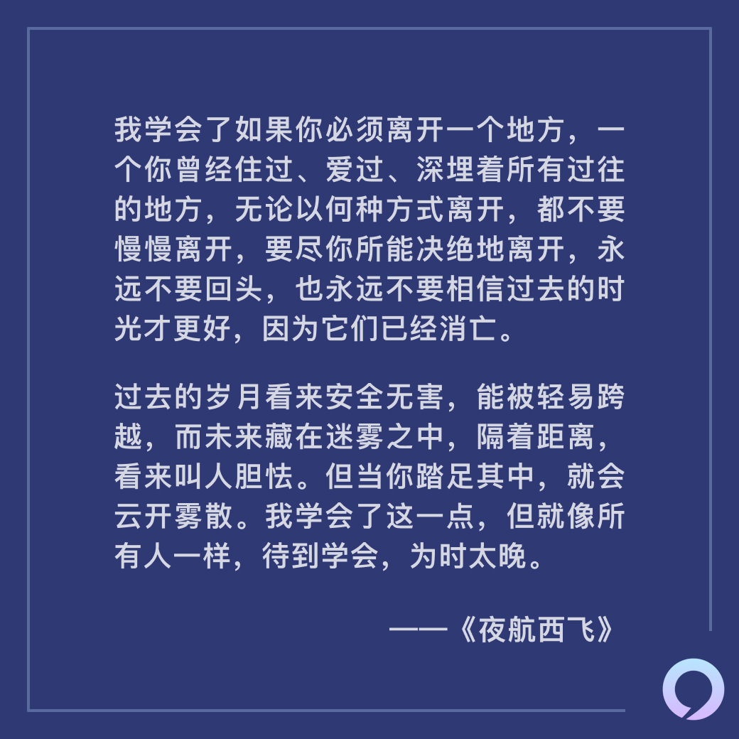 我学会了如果你必须离开一个地方,一个你曾经住过、爱过、深埋着所有过往的地方,无论以何种方式离开,都不要慢慢离开,要尽你所能决绝地离开,永远不要回头,也永远不要相信过去的时光才更好,因为它们已经消亡。过去的岁月看来安全无害,能被轻易跨越,而未来藏在迷雾之中,隔着距离,看来叫人胆怯。但当你踏足其中,就会云开雾散。我学会了这一点,但就像所有人一样,待到学会,为时太晚。——夜航西飞