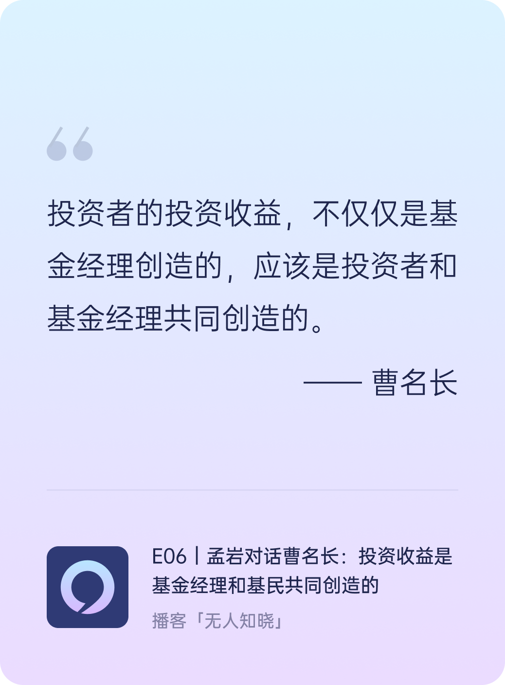 曹老师想给普通人管钱的想法,着实让人感动,谢谢曹老师的坚守 就像播客最后聊到的,我们普通人投资基金要看基金经理的投资逻辑投资理念,在自己认同的情况下,信任基金经理,这样才能更好的相伴 我想,这里还有一个前提条件是,投资者做好了资产配置,把这笔钱放到了合适的位置,钱的目标与买基金的预期是匹配的,例如投资者的这笔钱就是3~5年以上的相对长期的投资,毕竟基金股票市场变幻莫测,钱放对了位置,持有体验才会更好。短期要用的钱放到了股票基金标的上,就不太是好的投资选择了 另一方面,基民买入不适合自己的基金有多方面原因,销售平台机构的误导、投资者自身认知不到位等等,然后就像播客中曹老师聊到的,基金经理、发行机构也可以去与投资者有更好的沟通交流,还有有知有行,大家都在努力尝试解决这其中的一些问题,我相信未来会更好