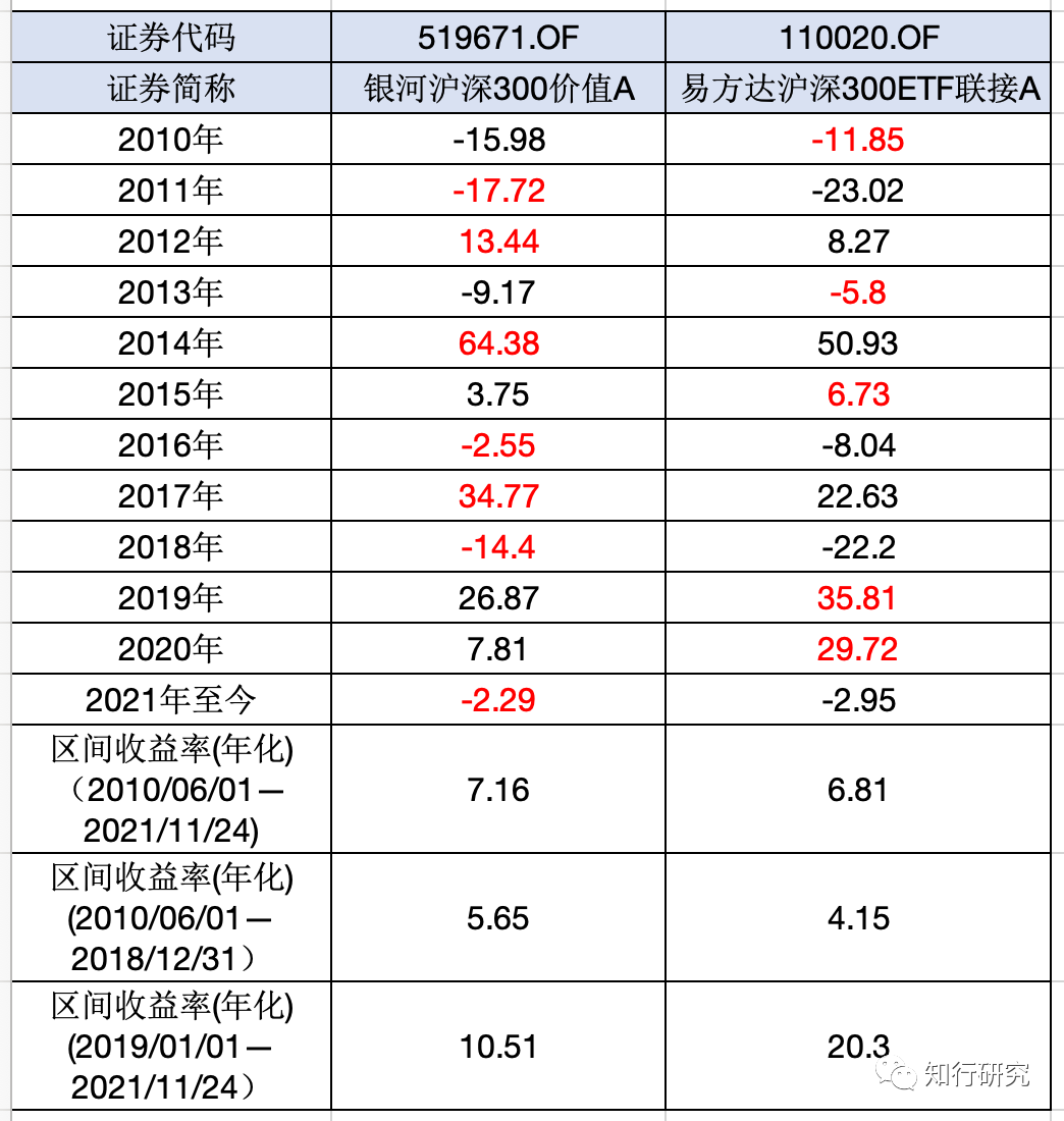 我们拿「银河沪深300价值」和「易方达沪深300ETF联接」做对比,前者成立于 2009 年底,所以从 2010 年开始对比。两个产品每年上也是各有所长,没有谁有绝对的优势。