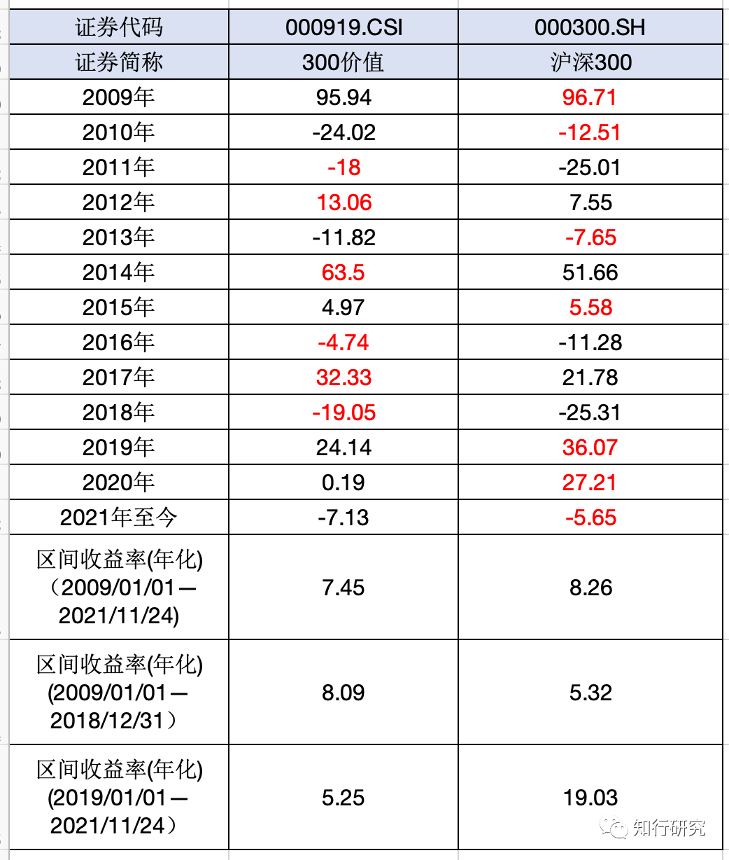 所以,在 2009 年到现在的年化收益率上,沪深300略高于300价值。