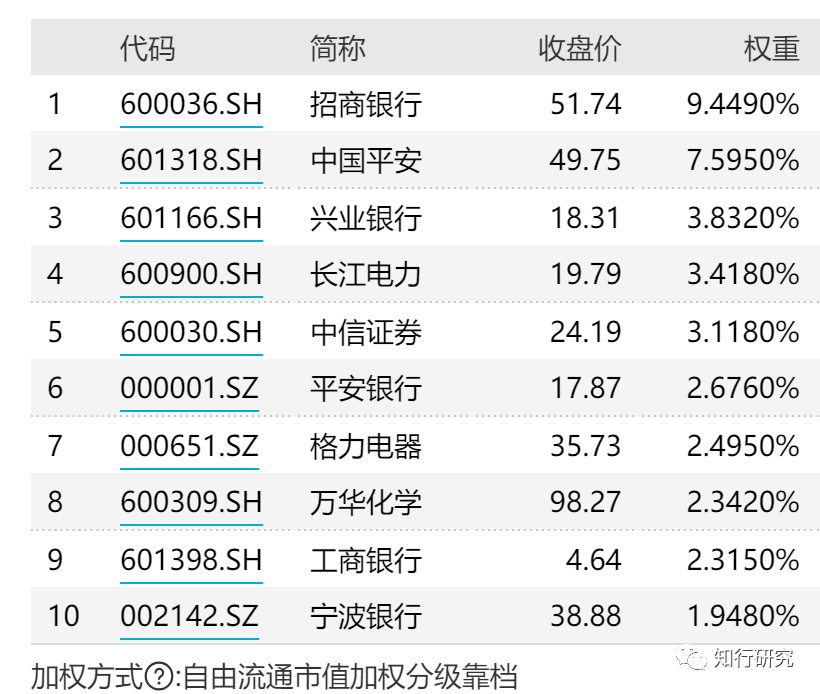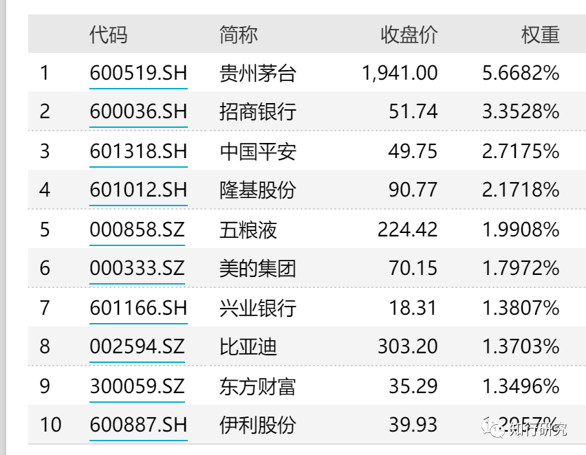 我们来看看哪些个股符合条件,下面是300价值的前十大权重股
