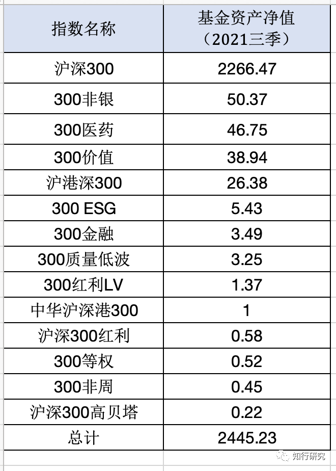 截止到 11 月 24 日,国内跟踪沪深300相关指数的公募基金情况如下,跟踪沪深300的规模是最高的,有 2266 亿,占比高达 93%,其他的都很小。