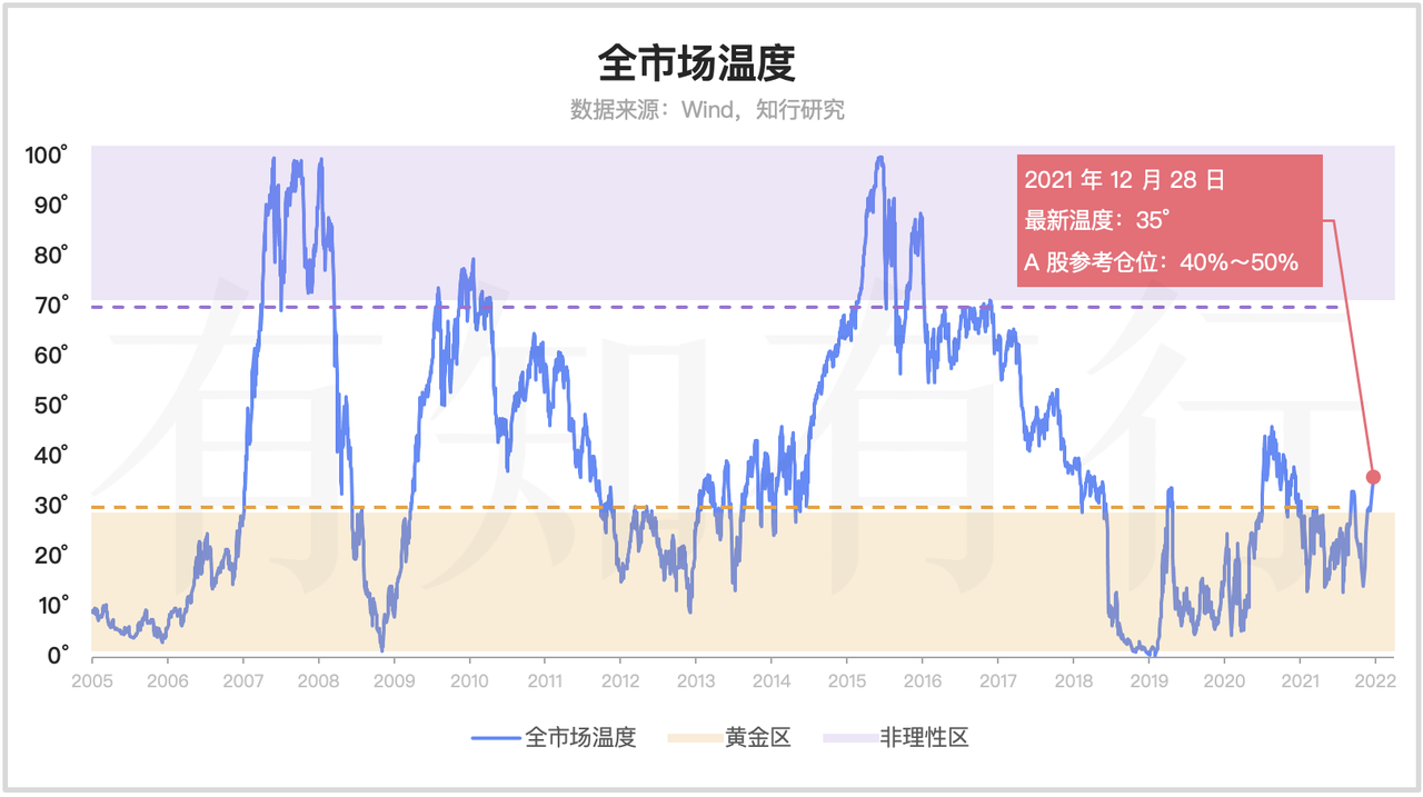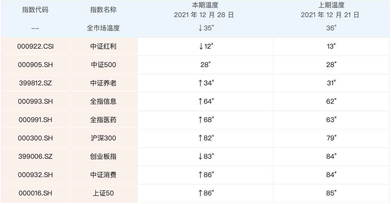 最新的全市场温度是 35°,跟上次比,小幅下跌。具体指数方面有涨有跌,变化都较小。目前中证红利、中证500和中证养老的温度还较低。