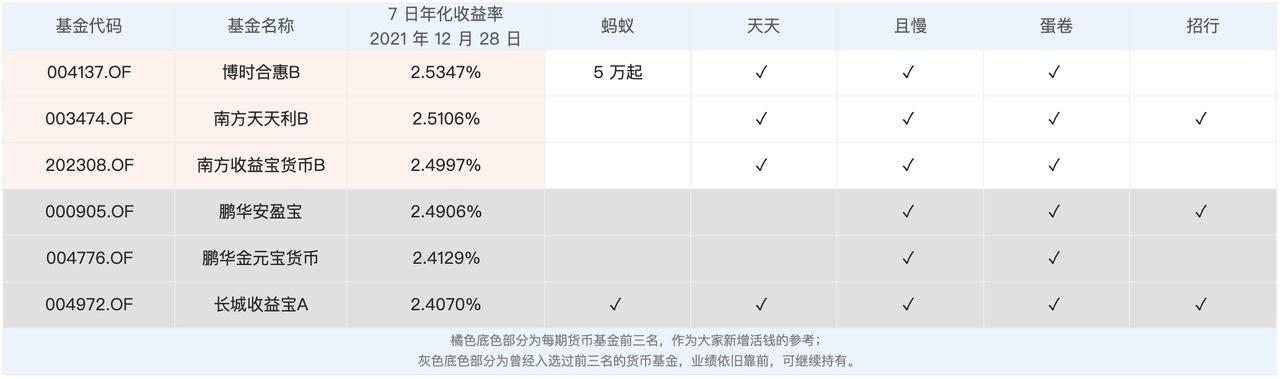 下面是我们给出的货币基金的名单,这几只基金的七日年化收益率在 2.5% 左右,业绩都不错,大家有需求的可以在自己熟悉的平台买入就行。