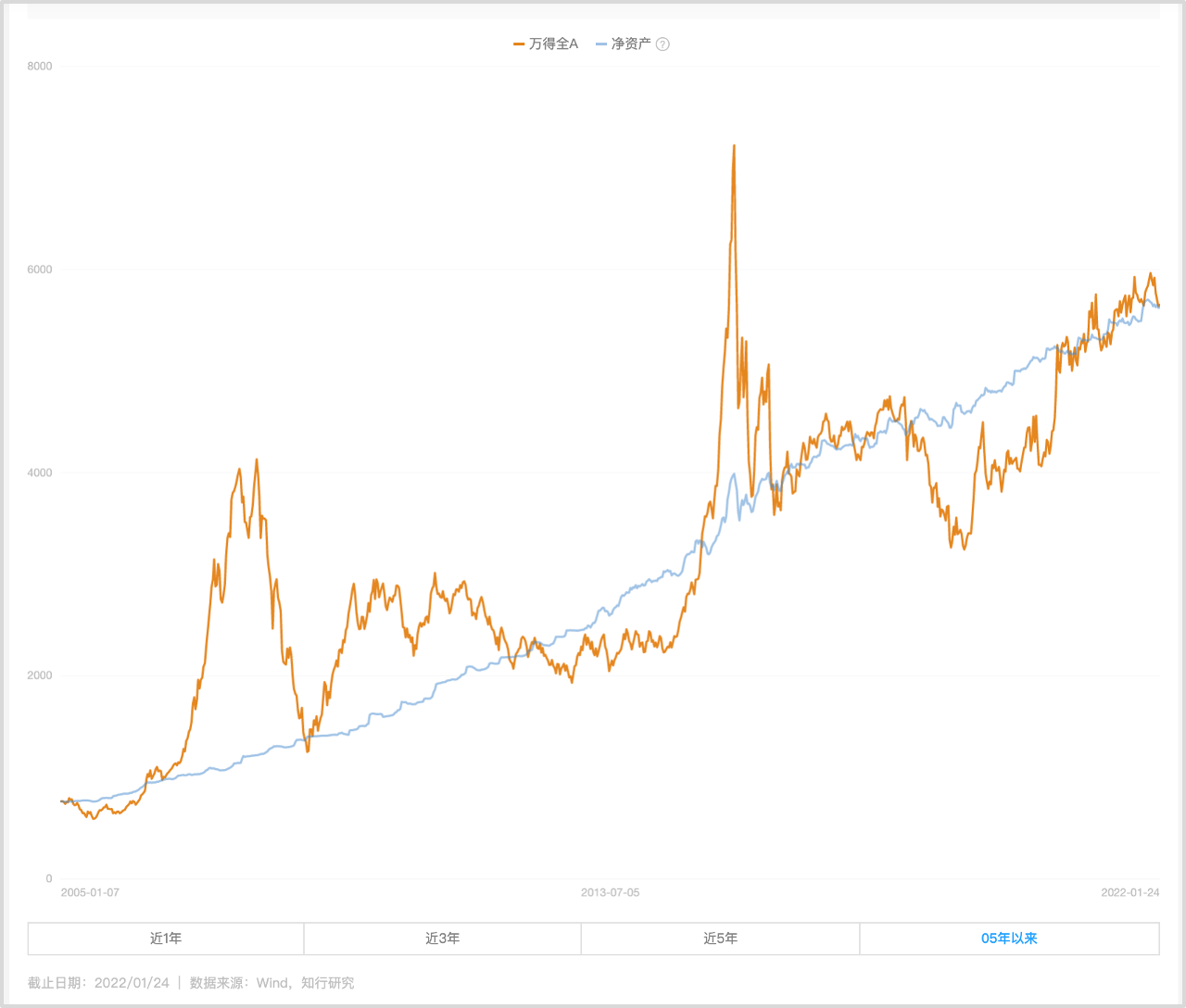 烦躁的时候,可以远离市场,或者看看下面这张图,万得全A指数在过去这么多年涨涨跌跌,但最终还是会回到国家整体的经济增长、回到企业的盈利增长上来。往长期看,会更淡定一些。