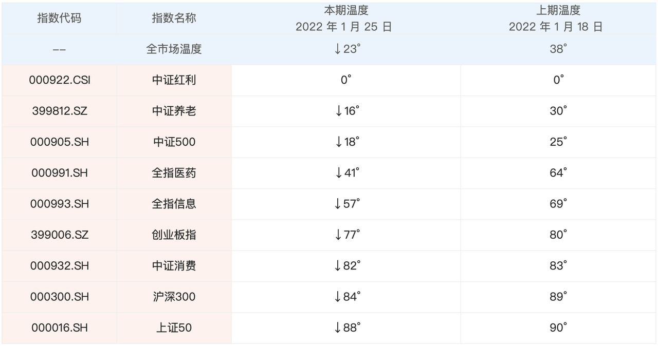 既然是普跌的行情,我们的全市场温度也下降了,最新全市场温度是 23°,下降幅度跟上周比,还是很大的。