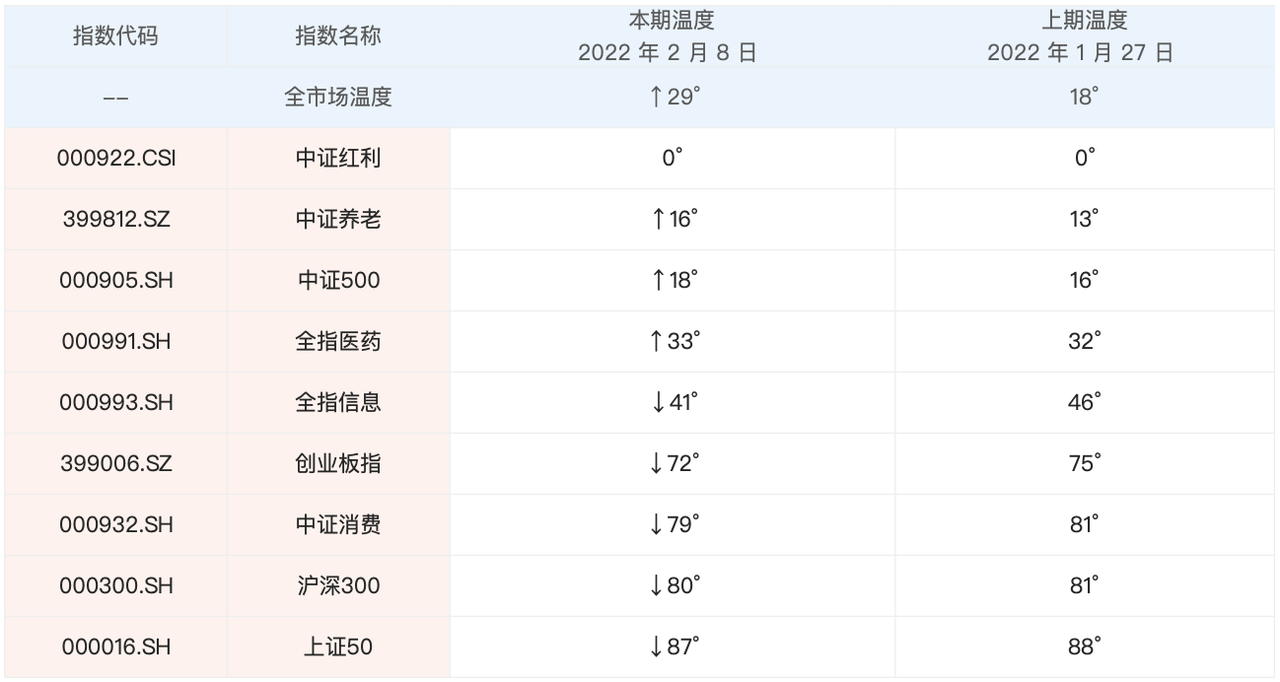 结合两天来看,A股整体是上涨的。我们的全市场温度涨到了 29°。具体指数里,中证红利、中证养老、中证500、全指医药的温度出现了上涨。中证红利、中证500和中证养老这两天反弹了 2% 左右,也让我们的黑板报策略能稍微回回血。