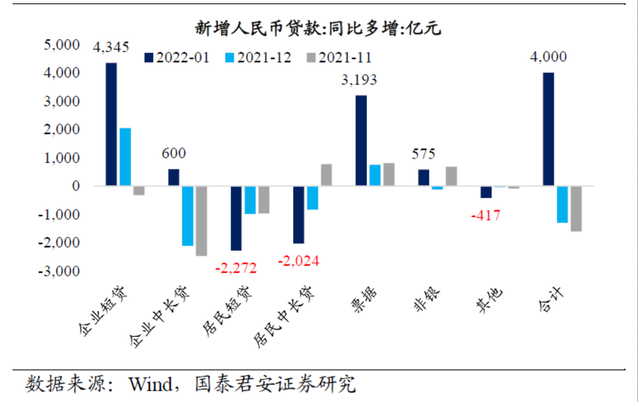 主要的原因是新增人民币贷款的结构不好。下图显示了新增人民币贷款的具体分项,我们能够清楚看到新增的 4000 亿主要去了企业短期贷款和票据融资,企业中长期贷款的增长较弱。