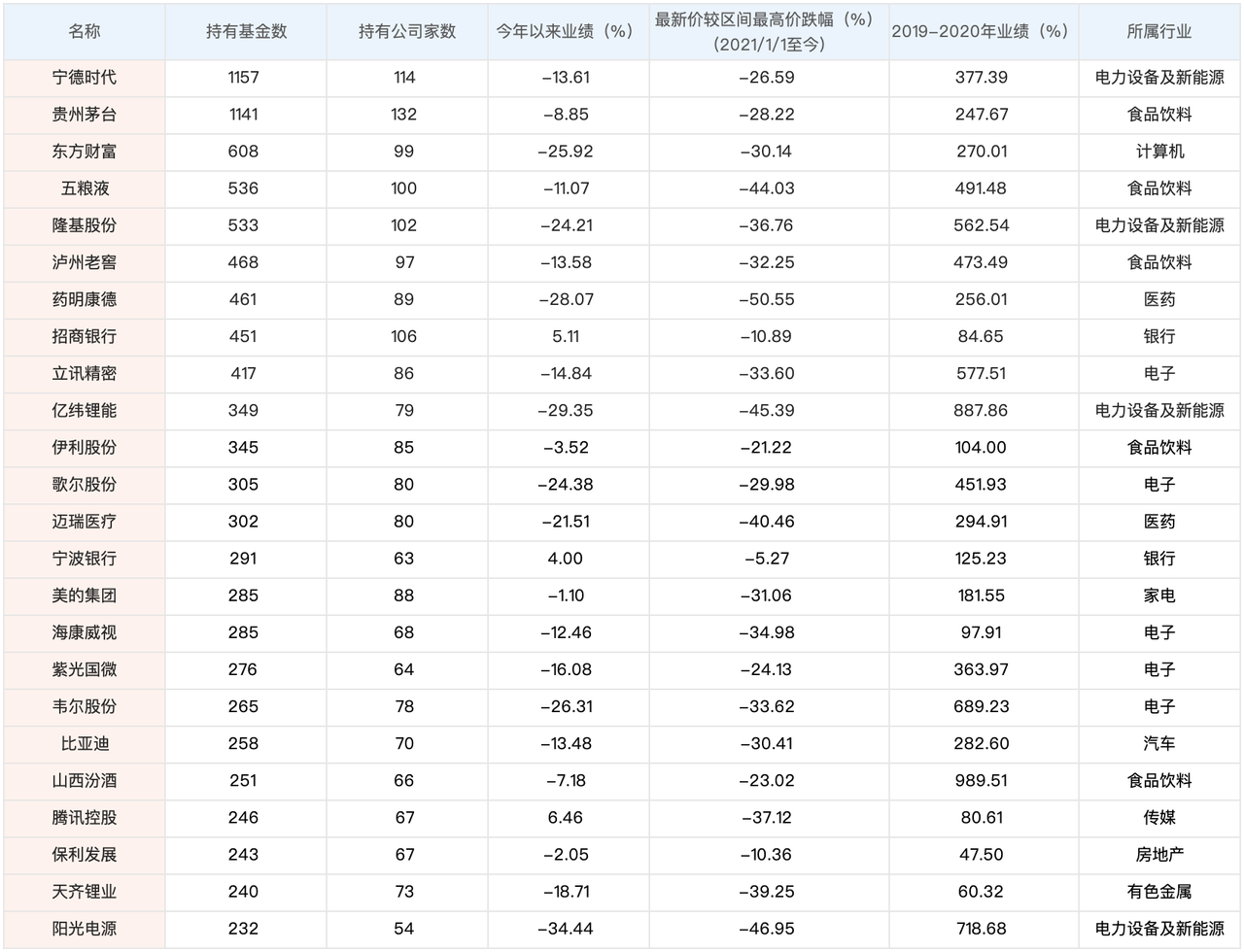 一旦高估值不能与企业的高增长相对应的话,很大概率会迎来大跌。在大跌的过程中,主动基金会由于主动卖出,或者由于用户的赎回去被动卖出,导致其持仓的个股出现下跌。我们看了一下去年四季度偏股型主动基金重仓持有的个股的表现情况,很多从去年高点到现在都出现了大幅下跌,可想而知,基金的业绩也好看不到哪里去。