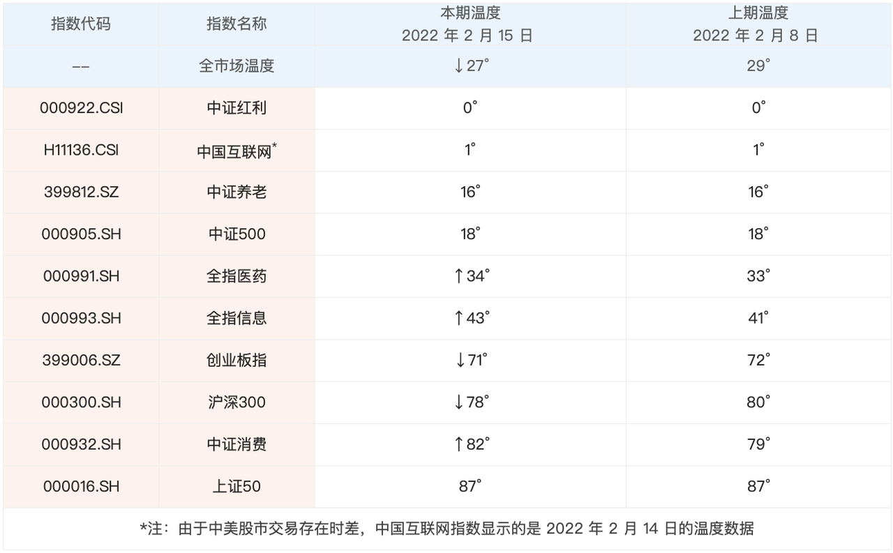 接下来我们来看一下市场温度情况。我们的全市场温度为 27°,跟上周相比,出现了小幅下跌。具体指数方面,有涨有跌,变化不大。