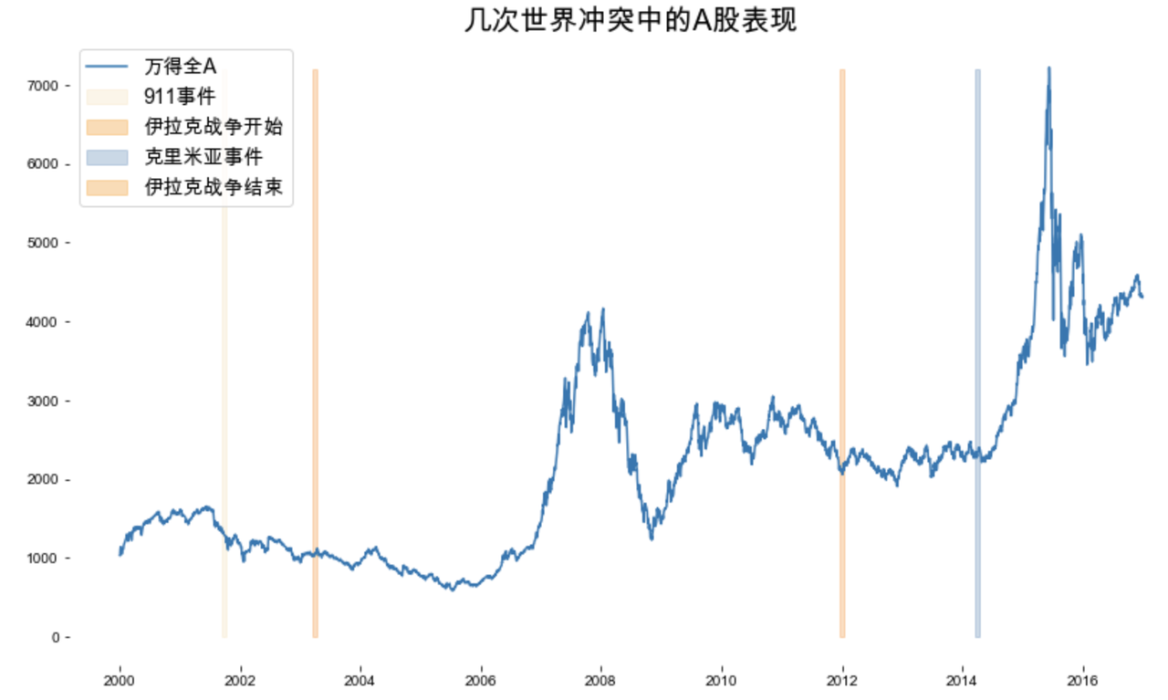 上海证券交易所于 1990 年 12 月 19 日正式营业,刚刚起步的A股市场并未受到海湾战争的影响。之后的「9·11」事件和伊拉克战争对A股市场的影响同样微乎其微。