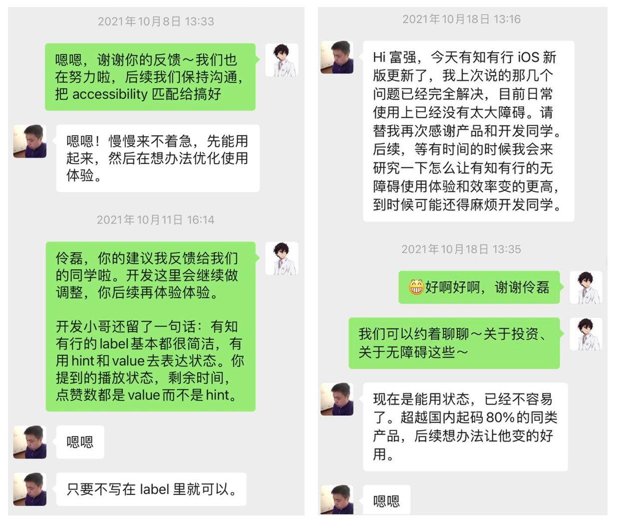 他是有知有行的用户,希望有知有行能改善 App 的无障碍兼容性。