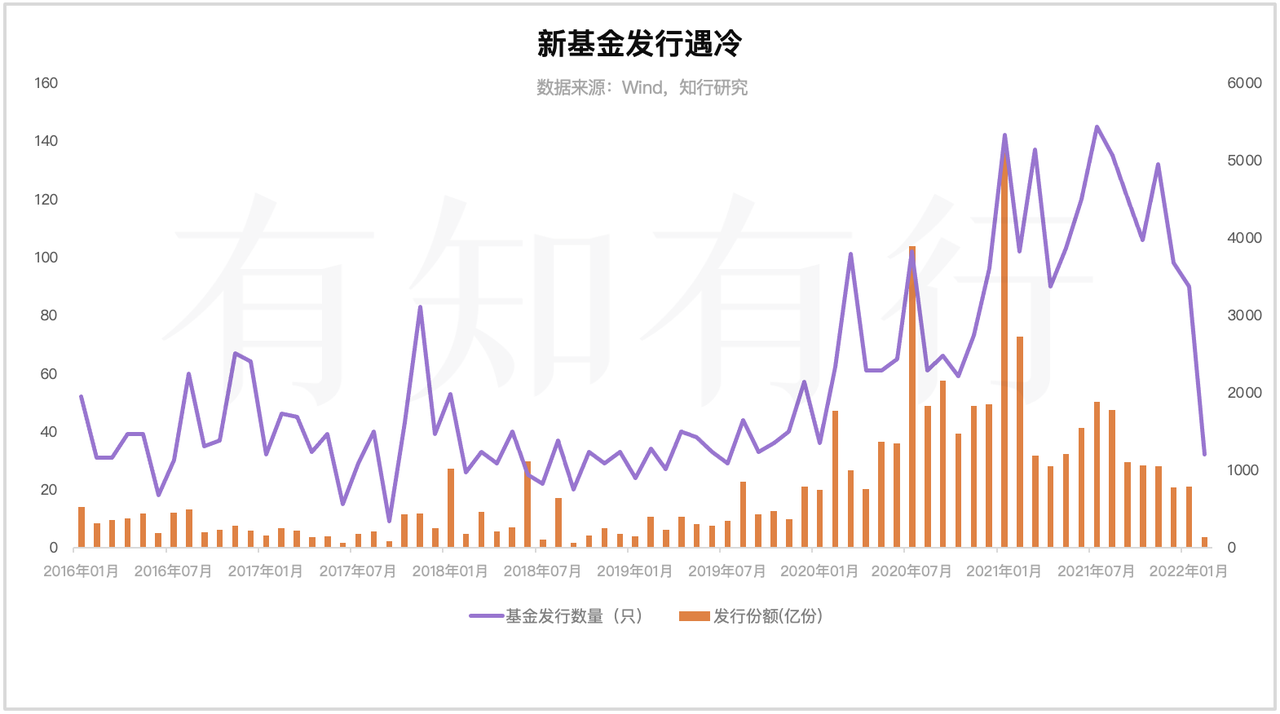 结果是,股票不论基本面怎么样,大家全线杀跌,看谁跑得快。新发基金也遇到了冰点。下面是股票型和混合型基金的发行情况,能够很清楚地看出来,2 月份的新基金发行数量和份额很低,已经达到了 2018 年 9 月、10 月的水平。