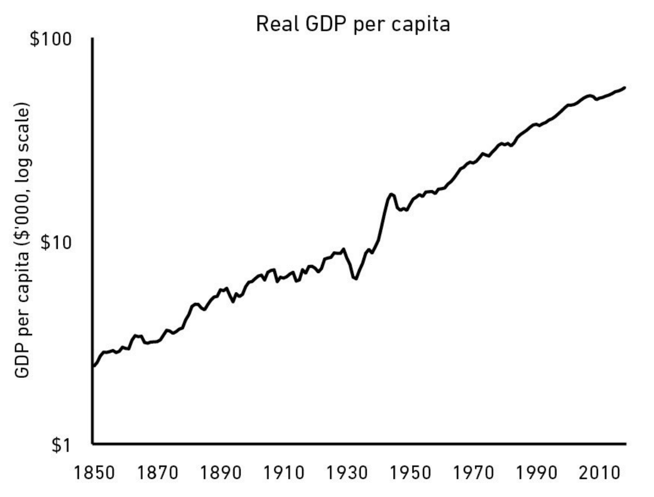 1. 美国 1850 年 ~ 2010 年的人均 GDP 走势: