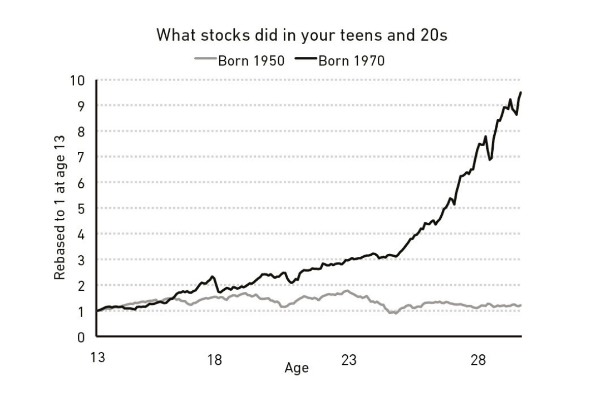 如果你出生于 1970 年,标普500指数在你十几二十岁的时候,几乎涨了十倍,回报惊人;如果你出生于 1950 年,在你十几二十几岁的时候,市场几乎没有什么变化。仅仅因为出生年份不同,两代人会以截然不同的观点看待股票市场,度过这一生。