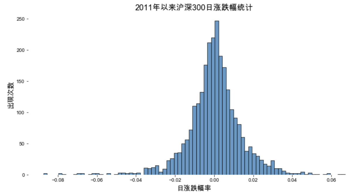 下图是 2011 年以来沪深300日涨幅统计。从图中我们可以看出,2011 年以来,沪深300涨的天数和跌的天数基本对半,而且大部分日涨跌幅都集中在【 -0.01,0.01 】这个区间,也就是说大多数时候的单日涨跌幅并不大。